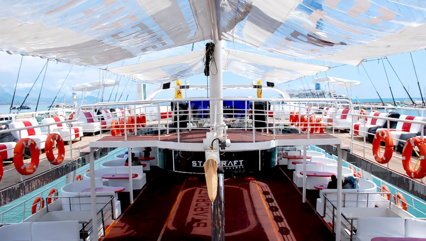 Instant confirmation: Your reservation is confirmed immediately after booking. Booze Cruise Ticket: Upgrade to 35€ for unlimited beer and wine throughout the entire 7-hour tour. Largest boat in Alanya: Starcraft is the only fibreglass modern boat in Alanya’s harbour — capacity of 600 passengers across 5 decks with dedicated bars, toilets, showers and changing cabins cleaned throughout the day. Water sports at Cleopatra Beach: Various sea activities available during the swimming stop. Additional cost applies — ask on board for the price list. Seabob underwater scooter: Available for rent on board. Contact us for current pricing. Sea turtles: Turtles are occasionally spotted on the surface during the shipyard bay swimming stop. Night Disco Cruise: Starcraft also operates an evening party tour. Contact us for schedule and pricing. |