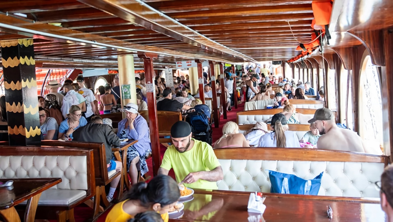 | TOUR PROGRAM | • Pick-up from accommodation between 09:00 and 09:45 • Arrival at Alanya Kaleiçi port — departure at 10:00 • 1st stop: Red Tower and historic Shipyard — swimming break • Cruise around the Alanya Castle peninsula • Visit to Pirates’ Cave, Lovers’ Cave and Phosphorus Cave — swimming break • Cruise to Ulaş Bay — 1-hour free time (can go ashore, water sports available) • Lunch served on board • Open-sea cruise after lunch — swimming break • Stop at Cleopatra Beach — swimming break • Panoramic return cruise around Alanya Castle • Arrival at Alanya port at 15:30 — drop-off at accommodation |