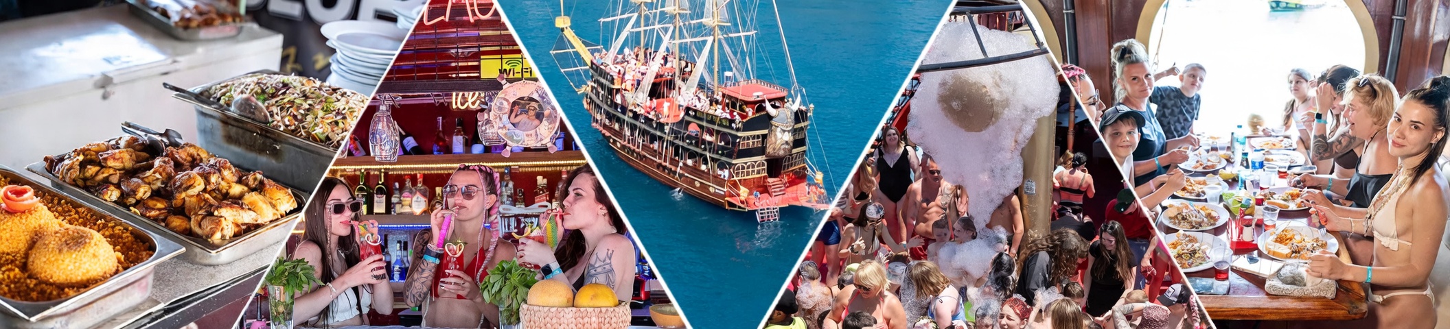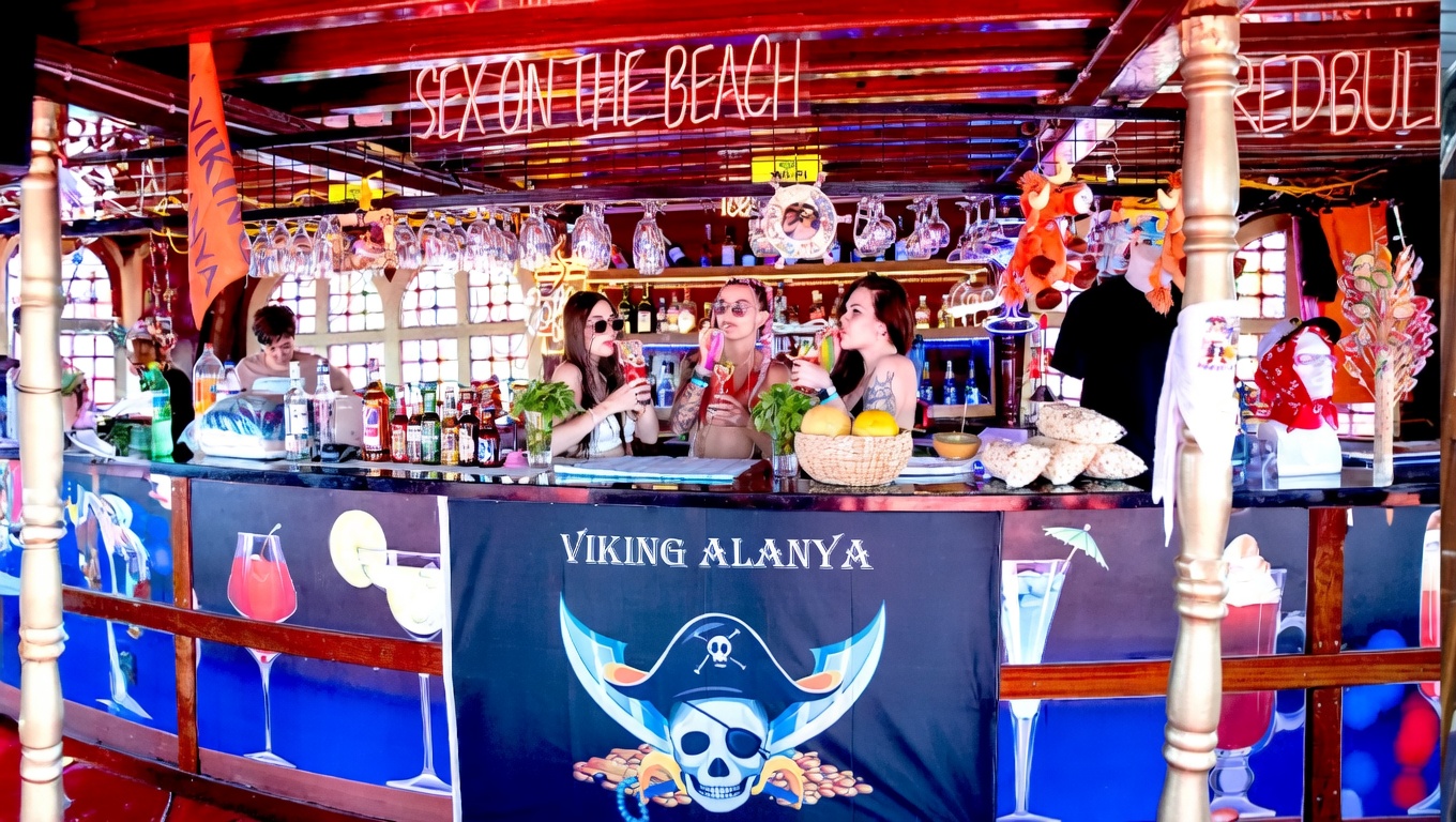 Instant confirmation: Your reservation is confirmed immediately after booking. Best value daytime boat tour: At 18€ per adult, the Viking Boat Tour is the most affordable full-day boat tour in Alanya with transfer, lunch and animations included. 5 swimming stops: The Viking tour offers more swimming stops than most other boat tours — visiting the Shipyard bay, cave area, open sea, Cleopatra Beach and Ulaş Bay. Water sports at Ulaş Bay: Various sea activities available at the water sports centre during the 1-hour stop. Additional cost applies. Viking-themed entertainment: Animators in Viking costumes perform shows and lead group games throughout the day. Foam party and DJ music on the dance floor. Family friendly: Children’s group games and animation runs all day. Babies travel free of charge. |